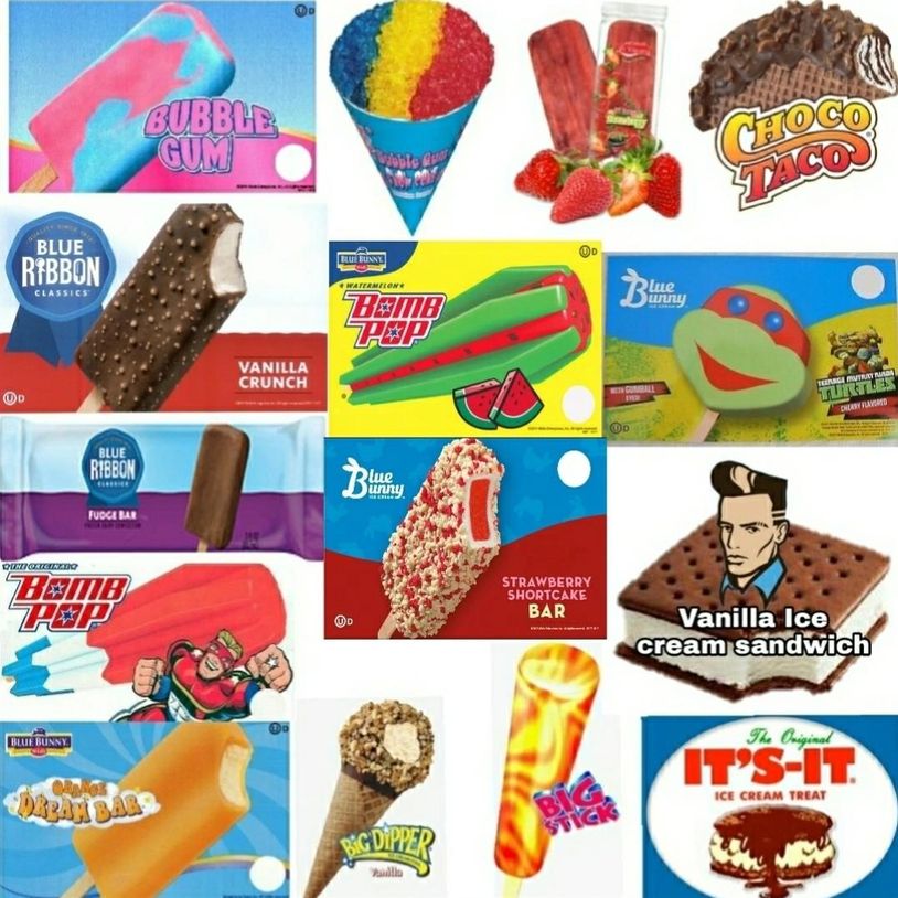 An assortment of prepackaged novelty bars that include: Big Sticks, Its Its , Choco Tacos, VANILLA ICE cream sandwiches, TMNT bars ,Snow Cones, Bomb Pops, Big Dipper Cone, Vanilla Crunch Bar, Orange Dream Bar, Strawberry Shortcake bar, Watermelon Bomb Pop.
